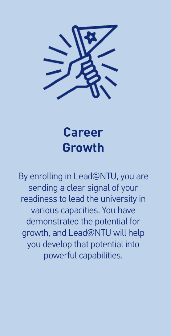 Lead@NTU is our premier career acceleration and leadership programme, and will guide you towards developing the skills, qualities and aptitude needed to thrive in your career.