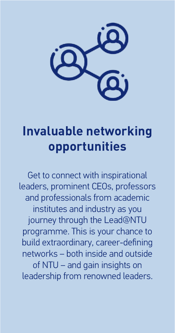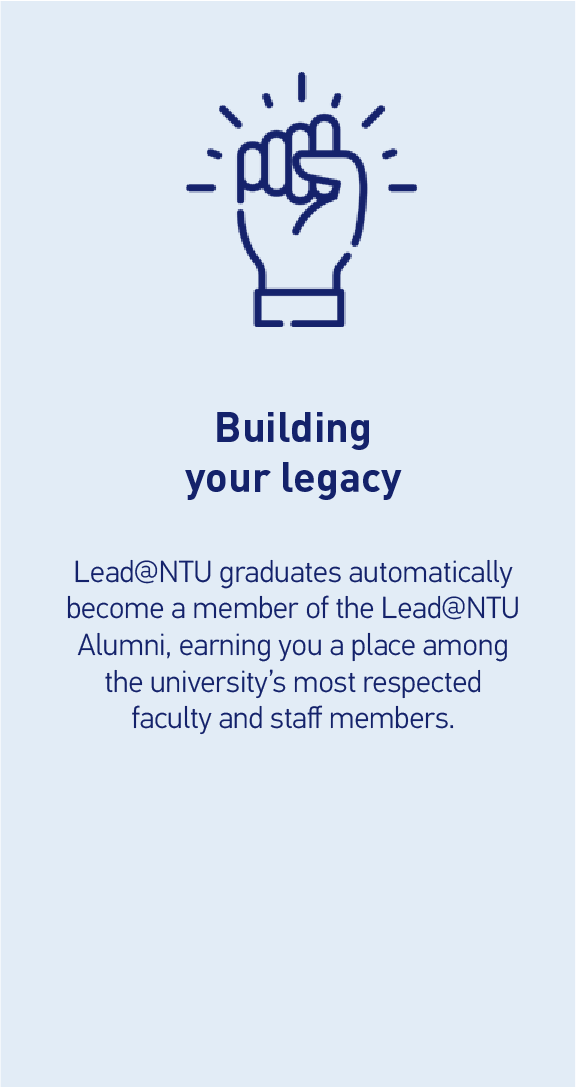 Lead@NTU graduates automatically become a member of the Lead@NTU Alumni and are entitled to participate in events and activities such as networking sessions, speakers series and many more.