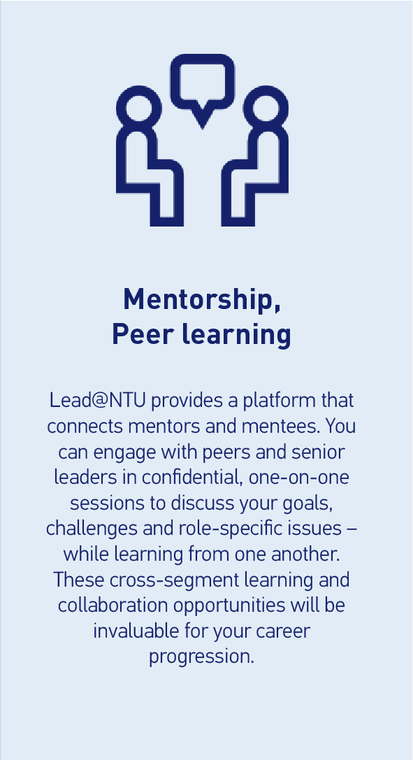 As a shortlisted Lead@NTU participant, you have the opportunity to engage in one of three leadership-focused programmes, depending on your current role.