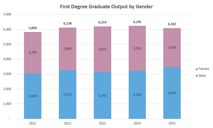 Graduate Output - First Degree & Higher Degree 20212022 2023 2024 2025 Click on the respective year for detailed statistics of the first degree graduate output by gender. 20212022 2023 2024 2025 Click on the respective year for detailed statistics of the higher degree graduate output by gender.