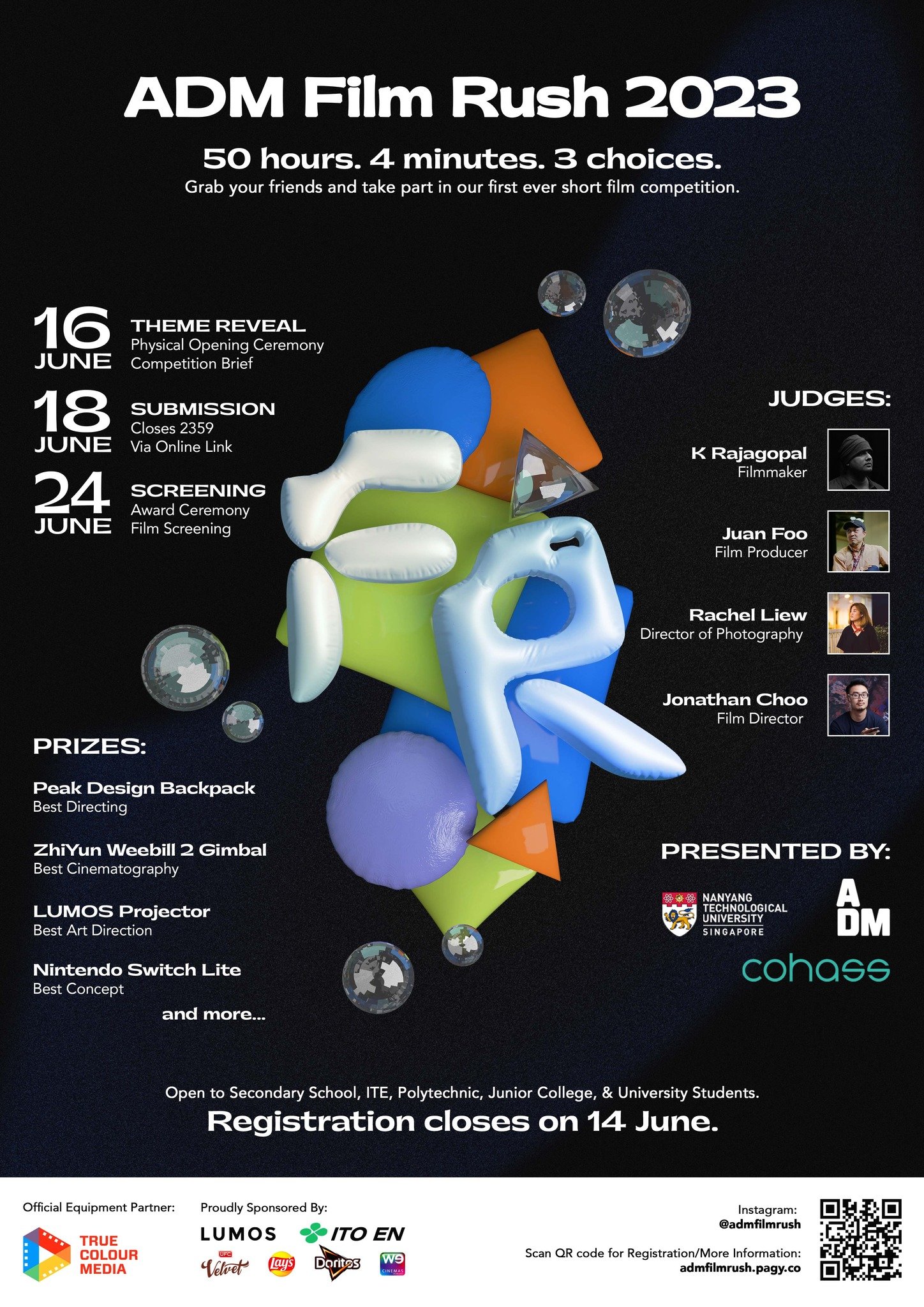 ADM Film Rush ’23 is a 50-hour student filmmaking competition. Participants will attend a briefing at NTU ADM, where 3 different lines of dialogue will be revealed. After choosing one of the dialogue options, they would then have the next 50 hours to shoot, edit, and submit a 4 minute short film that has their chosen line of dialogue incorporated creatively.