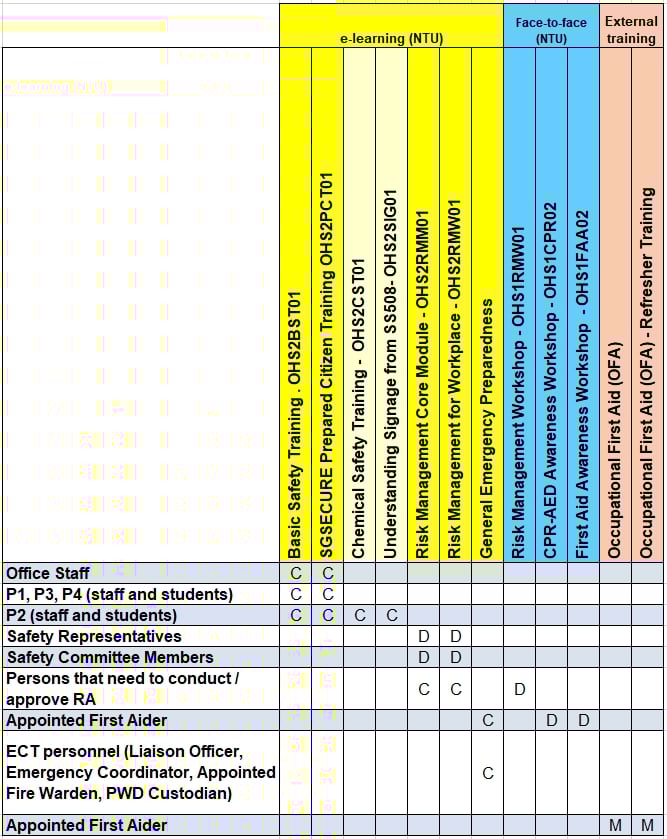 | M | Mandatory | Required by law and personnel are to complete training from accredited training centres. No waiver can be given unless with specific approval from the regulators or the ministries. | Before assigned for such work. |
