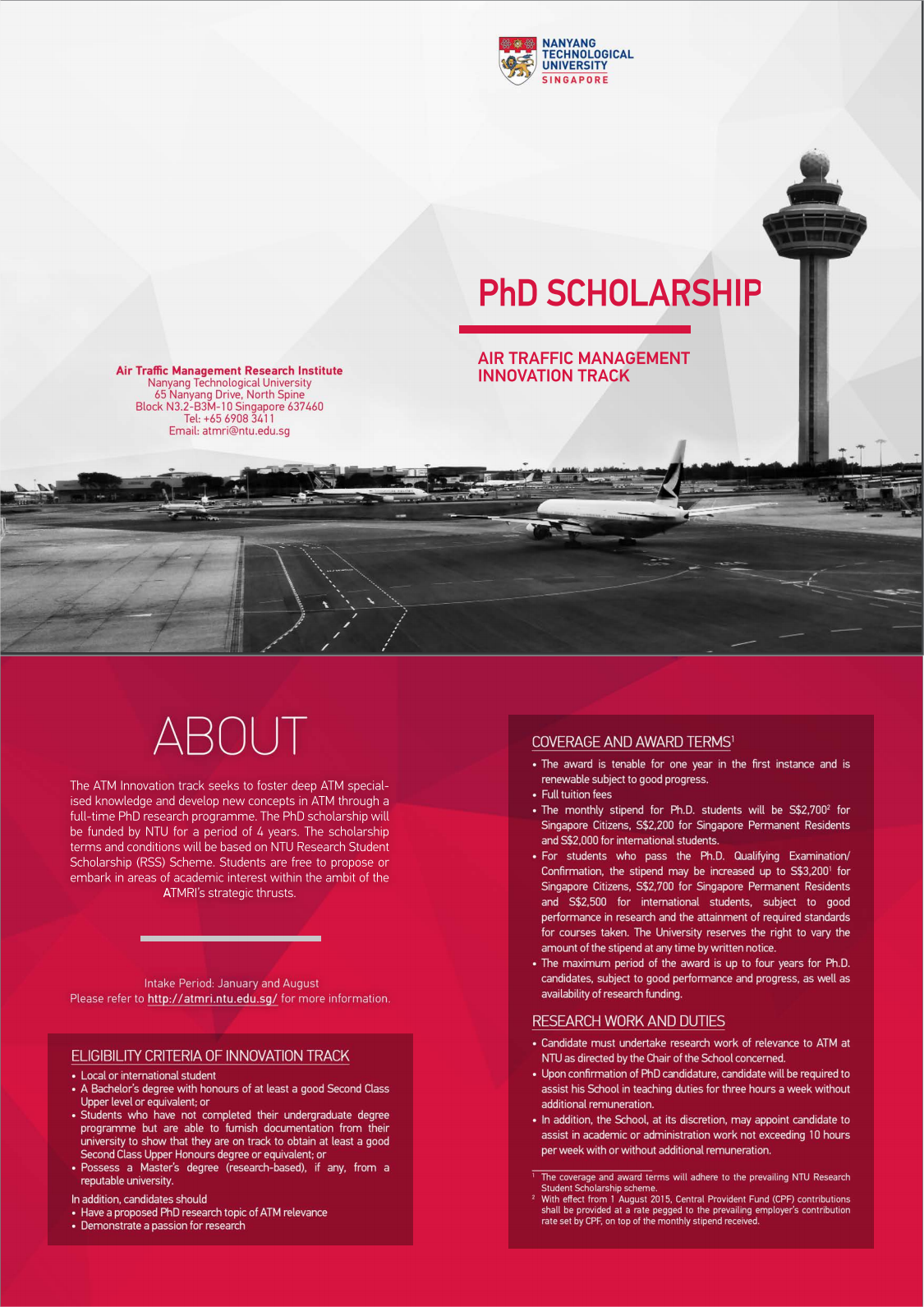 The ATM Innovation track seeks to foster deep ATM specialised knowledge and develop new concepts in ATM. PhD scholarships will be funded by NTU for a period of 4 years. The scholarship terms and conditions would be based on NTU Research Student Scholarship (RSS) Scheme. Students are free to propose or embark in areas of academic interest within the ambit of ATMRI's strategic thrusts. Students will be required to undertake a full -time PhD research course.