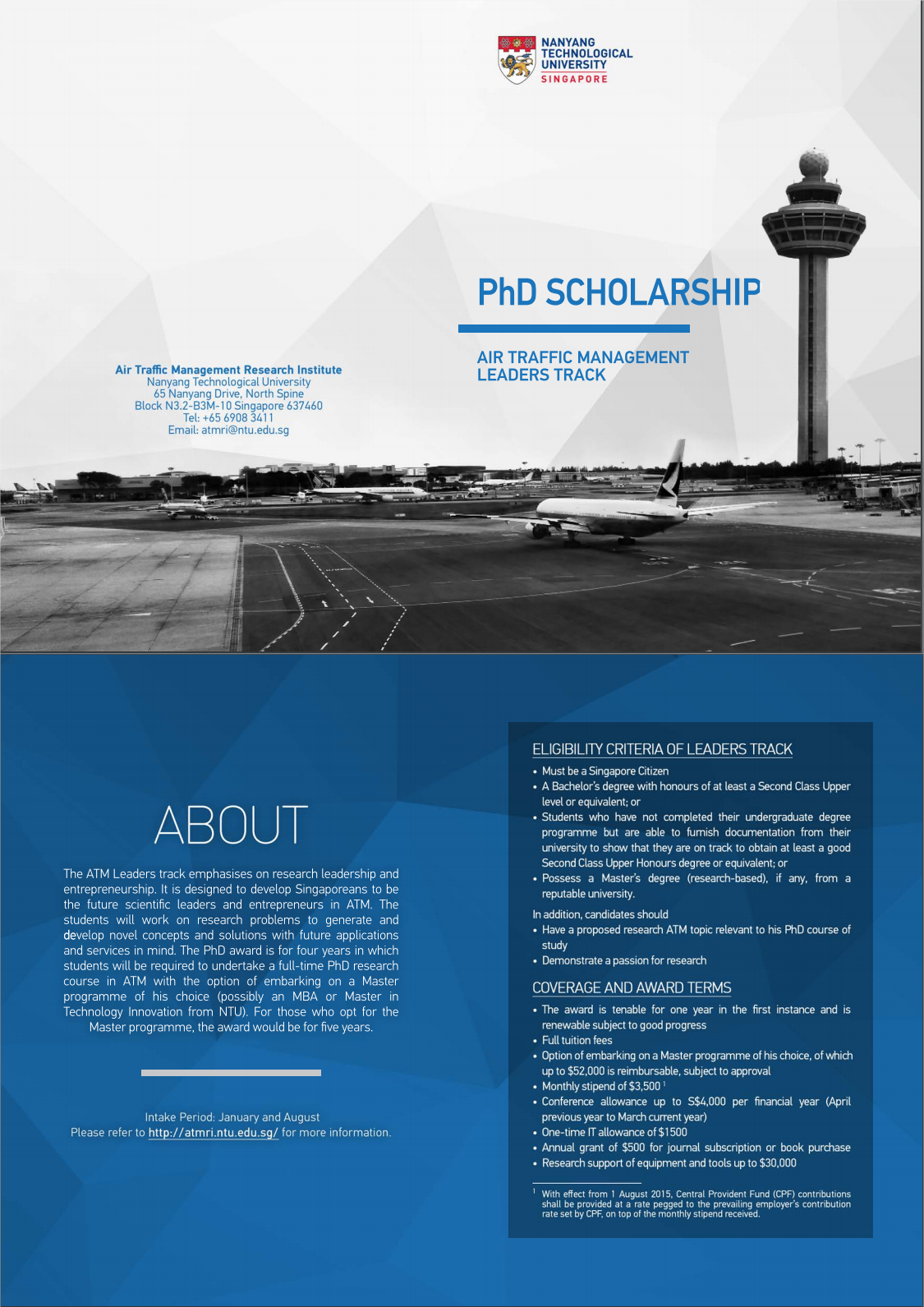 The ATM Leaders track emphasises on research leadership and entrepreneurship. It is designed to develop Singaporeans to be the future scientific leaders and entrepreneurs in ATM. The students will work on research problems to generate and develop novel concepts and solutions with future applications and services in mind. The PhD award is for four years in which students will be required to undertake a full-time PhD research course in ATM with the option of embarking on a Master programme of his choice (possibly an MBA or Master in Technology Innovation from NTU). For those who opt for the Master programme, the award would be for five years.
