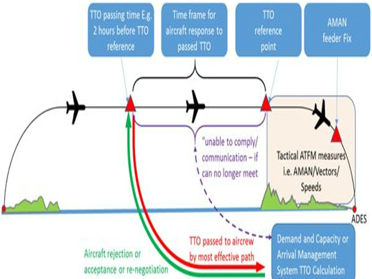 Under the LR-ATFM concept, long-range international flights will be assigned Target Time Overs (TTOs) over a waypoint (TTO-fix) well in advance to absorb the delay in the en-route phase of flight, where delay absorption is more efficient compared to terminal delay options.