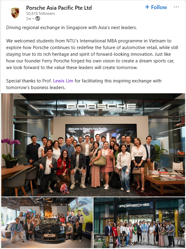 "We welcomed students from NTU's International MBA programme in Vietnam to explore how Porsche continues to redefine the future of automotive retail, while still staying true to its rich heritage and spirit of forward-looking innovation. Just like how our founder Ferry Porsche forged his own vision to create a dream sports car, we look forward to the value these leaders will create tomorrow."