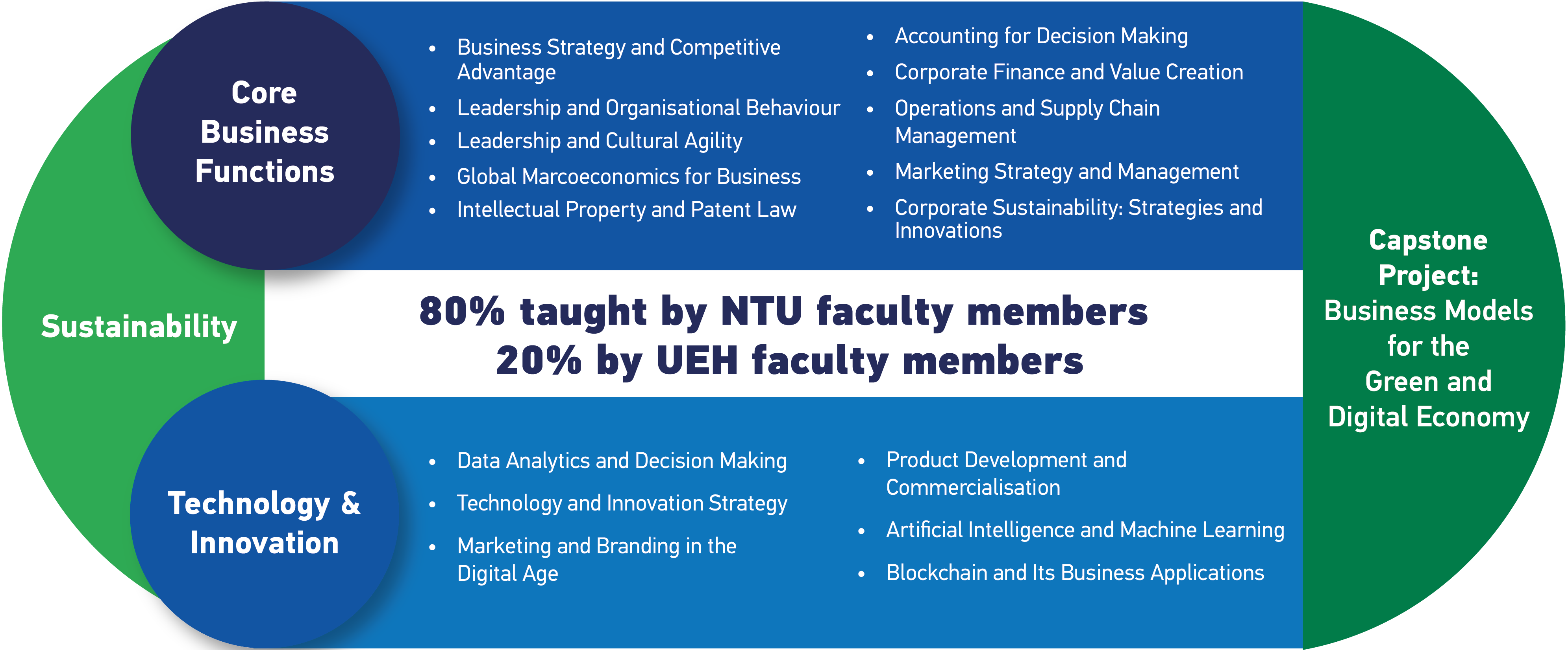 Experience the best of both worlds with 80% of courses taught by NTU faculty and 20% by UEH faculty.