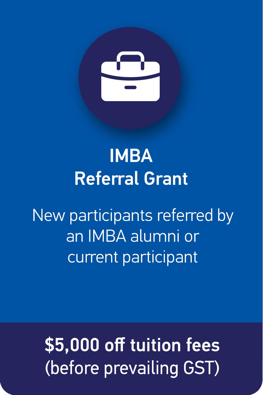 We value the strength of our alumni network and the trust our graduates place in the programme. New participants referred by an IMBA alumni or current participant are eligible for a one-time grant of $5,000 off tuition fees (before prevailing GST). This grant applies strictly to tuition fees and does not cover other programme-related costs.