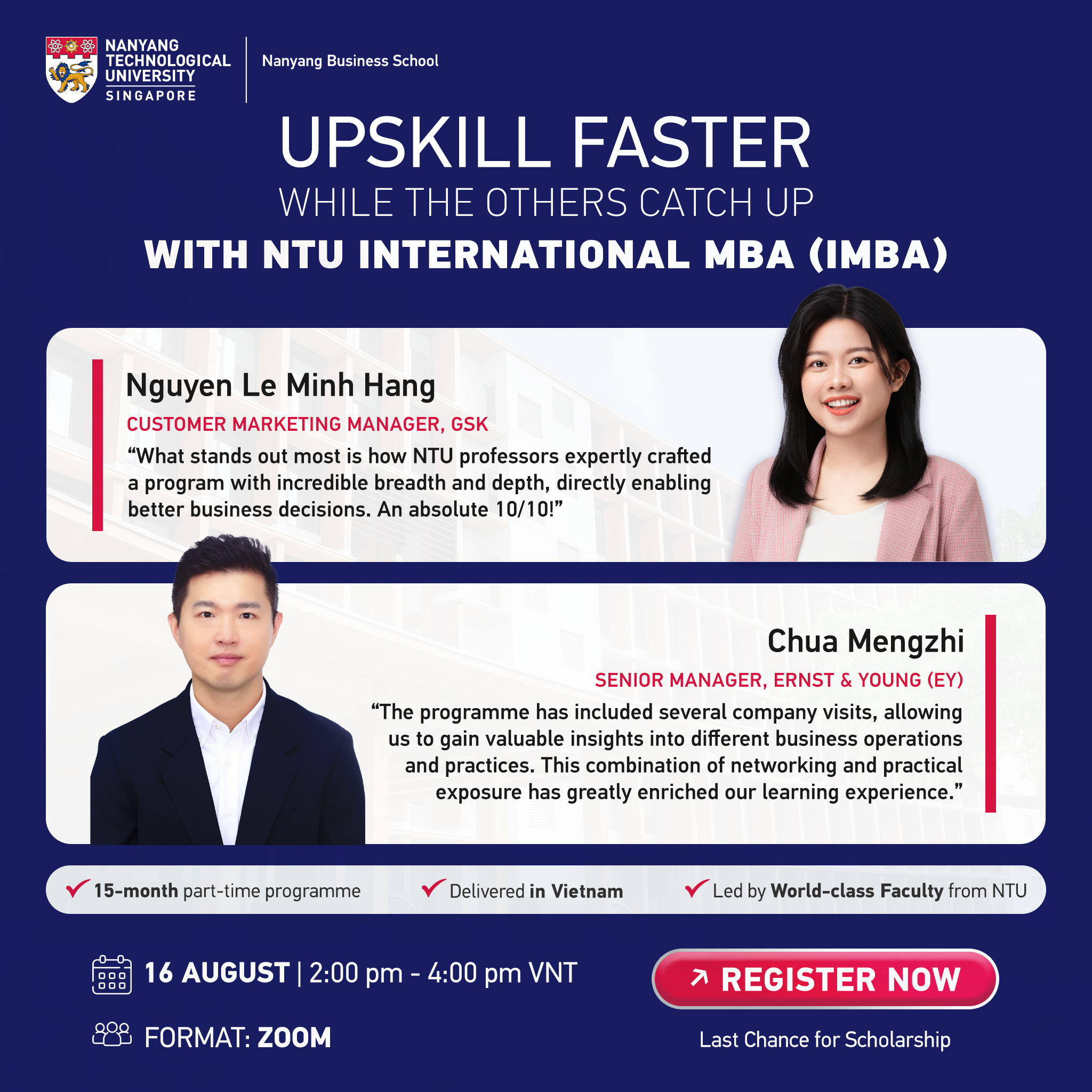 Meet the NTU International MBA (IMBA) team and our current students on Saturday, 16 August 2025 via Zoom to find out more.