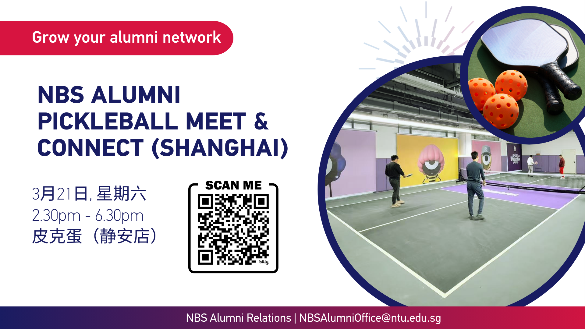 Calling NBS alumni - we’re excited to be organising our very first NBS Alumni Pickleball Meet & Connect in Shanghai on Saturday, 21 March! Join us for light rallying, friendly games, and a relaxed time reconnecting with fellow alumni - with a coach on site to guide us, so all levels are welcome. A simple tea break will be provided. See you on the court!