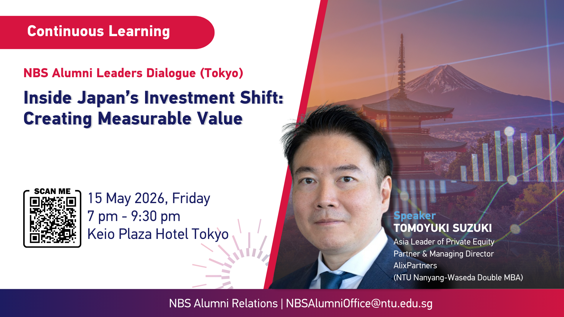 In this session, Tomoyuki Suzuki (NTU Nanyang-Waseda Double MBA 2008), Asia Leader of Private Equity and Partner & Managing Director at AlixPartners, will examine the current dynamics of the M&A and Private Equity market in Japan, including how deal sourcing, investment theses, and execution approaches are evolving. Through concrete, real world cases, he will highlight how investors and corporates are navigating complex stakeholder environments, operational constraints, and market specific risks.