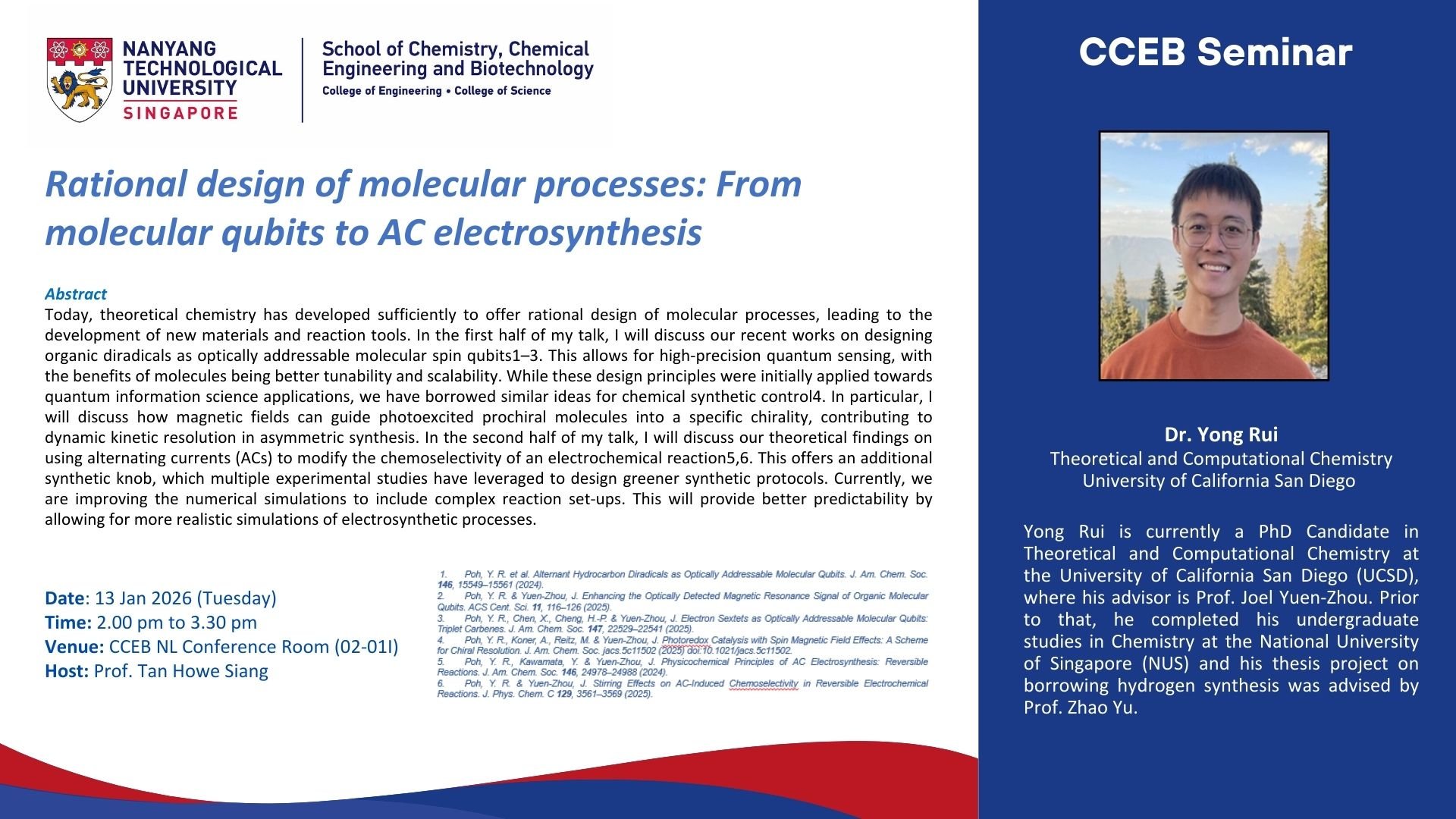 Yong Rui is currently a PhD Candidate in Theoretical and Computational Chemistry at the University of California San Diego (UCSD), where his advisor is Prof. Joel Yuen-Zhou. Prior to that, he completed his undergraduate studies in Chemistry at the National University of Singapore (NUS) and his thesis project on borrowing hydrogen synthesis was advised by Prof. Zhao Yu.