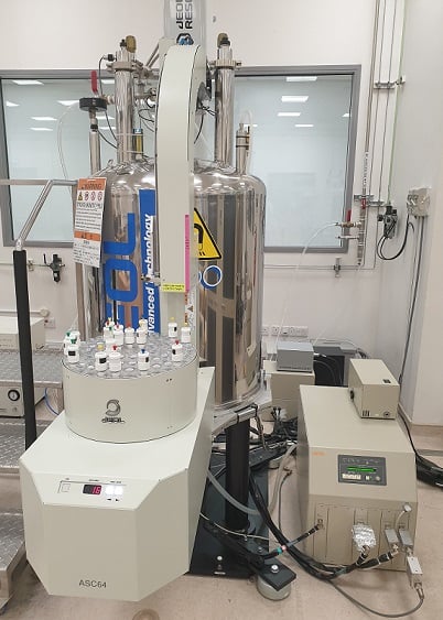 UltraShield 400MHz magnet with auto-tunable liquid probe, equipped with 64-position auto-sampler.