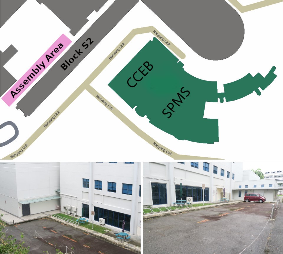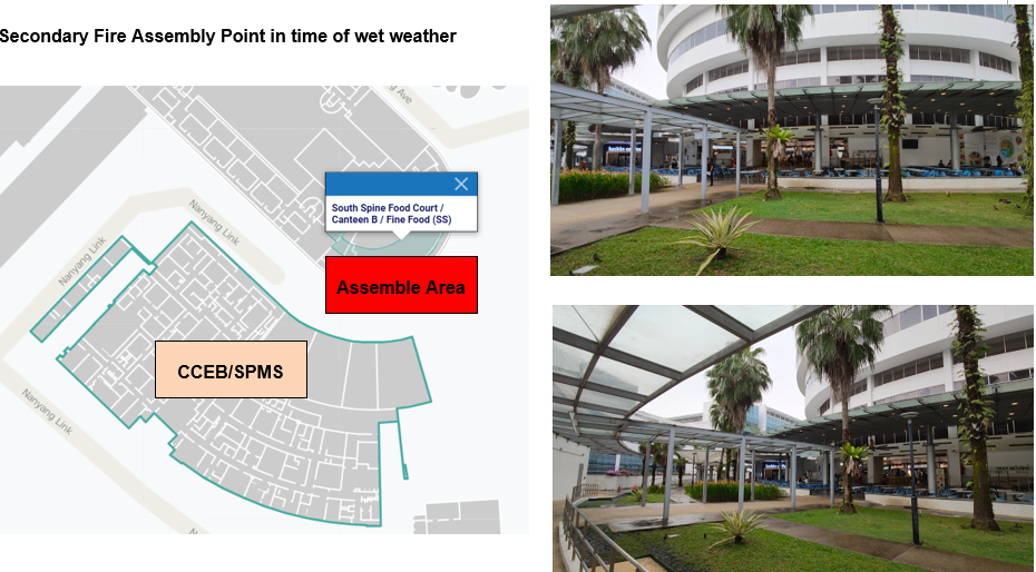 The emergency assembly area for the CCEB building is located behind Block S2 (one of the buildings used by the School of Electrical Engineering), as shown in the image below.
