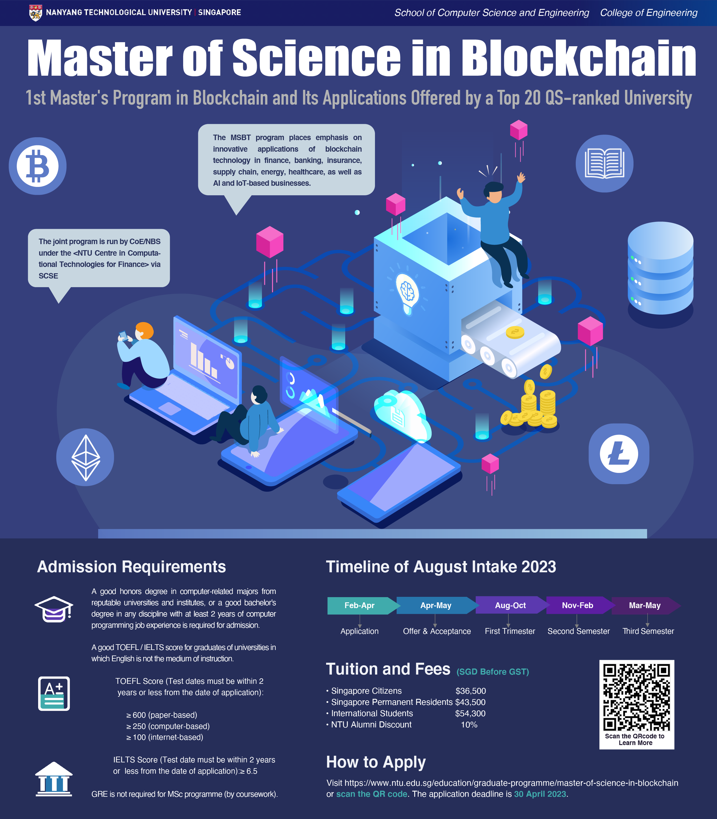 Our Master of Science in Blockchain Programme is proposed to bridge this gap in the current graduate education in blockchain technology, and is targeted towards fresh graduates, working adults, and mid-career reskilling and upskilling adults to help them embrace opportunities in this new era of blockchain.