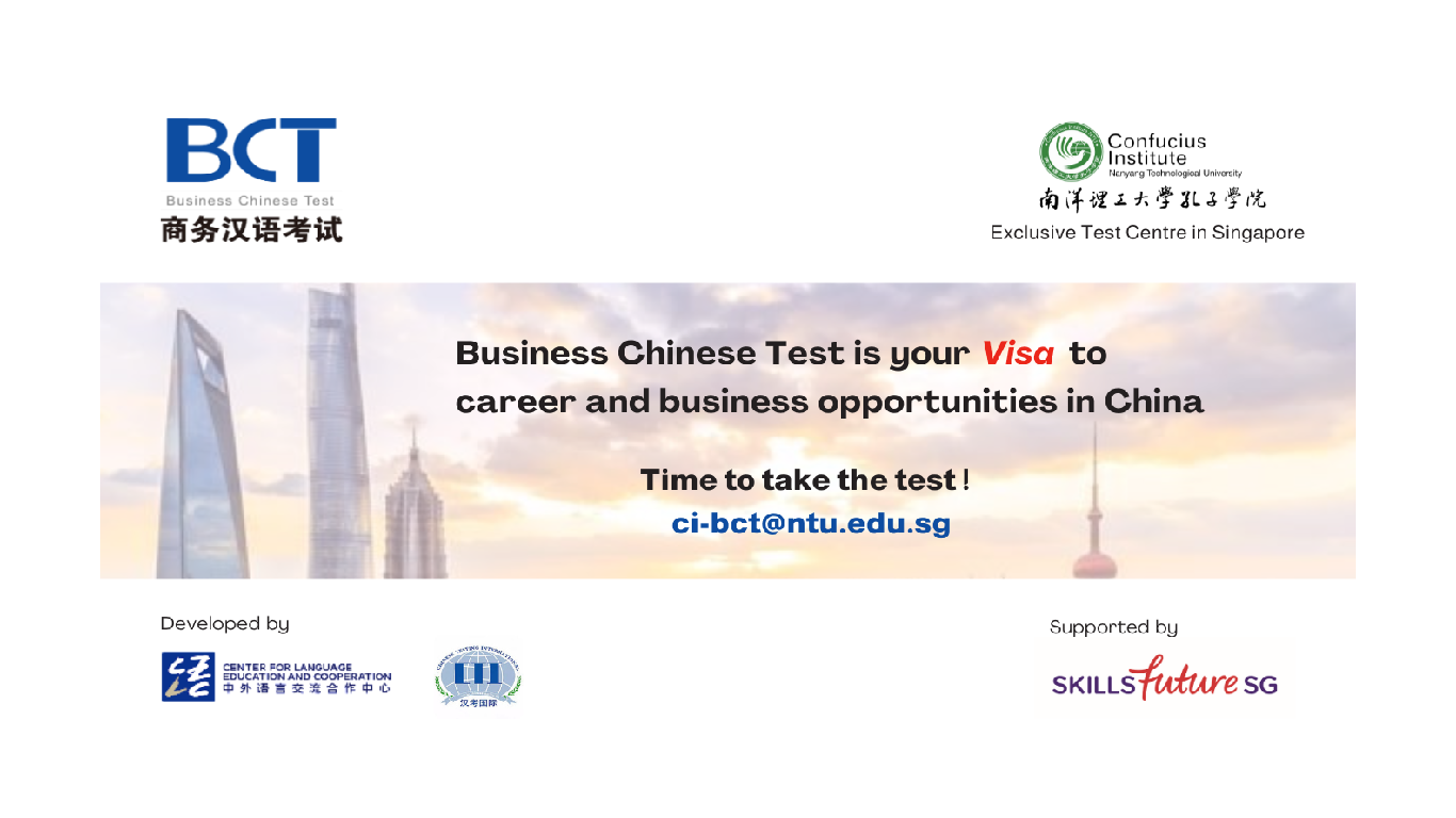 Confucius Institute NTU: Exclusive Test Center for Business Chinese Test in Singapore. Prove your ability to communicate effectively with Business Chinese skills so that you can stand out against the competition and unlock business opportunities in China.