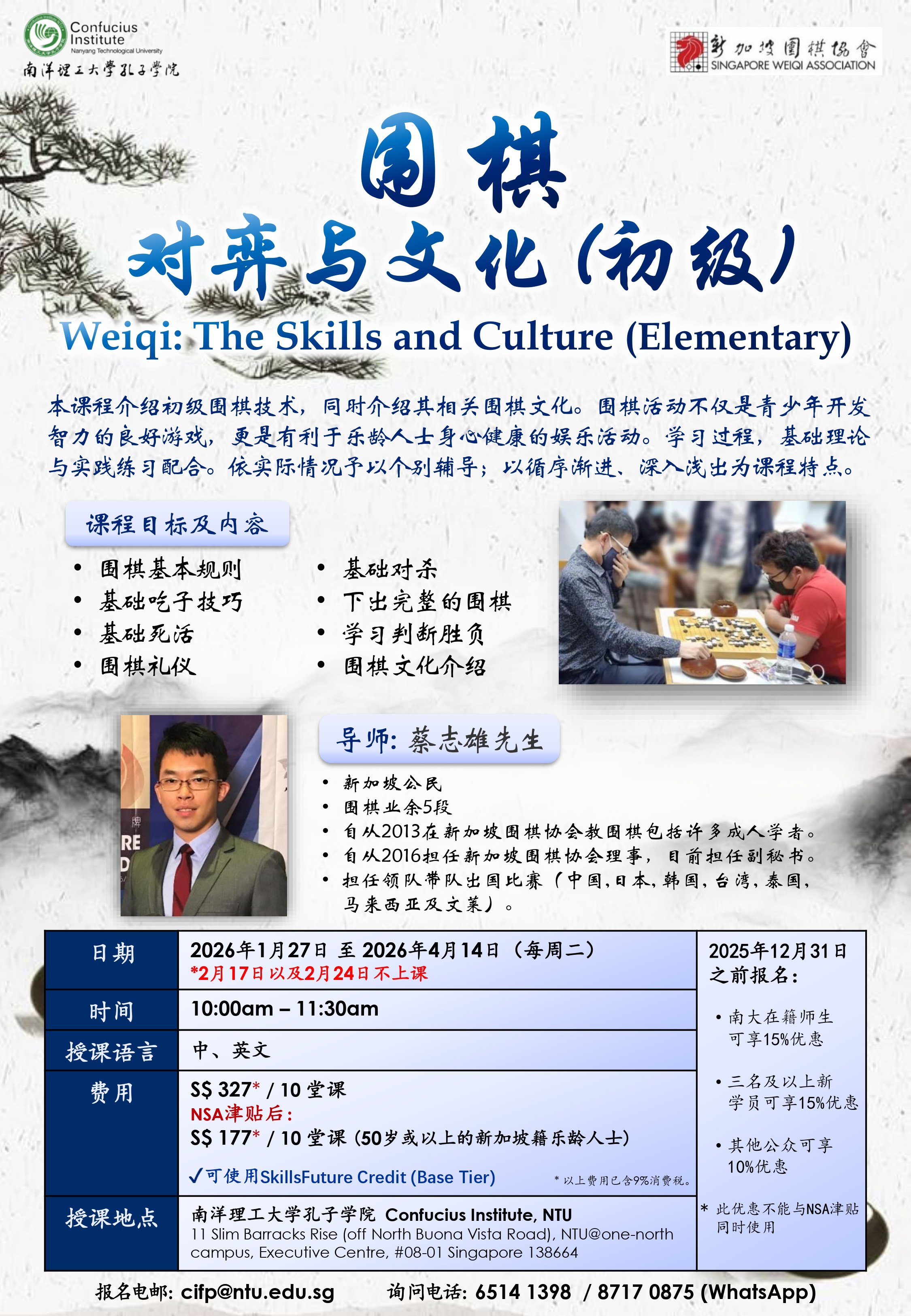 本课程将由资深围棋导师蔡志雄先生(Mr Chuah Chee Hiong)亲自授课,带领学员从零基础出发,系统学习围棋规则、基本技巧与实战演练,并深入了解围棋所蕴含的文化内涵。