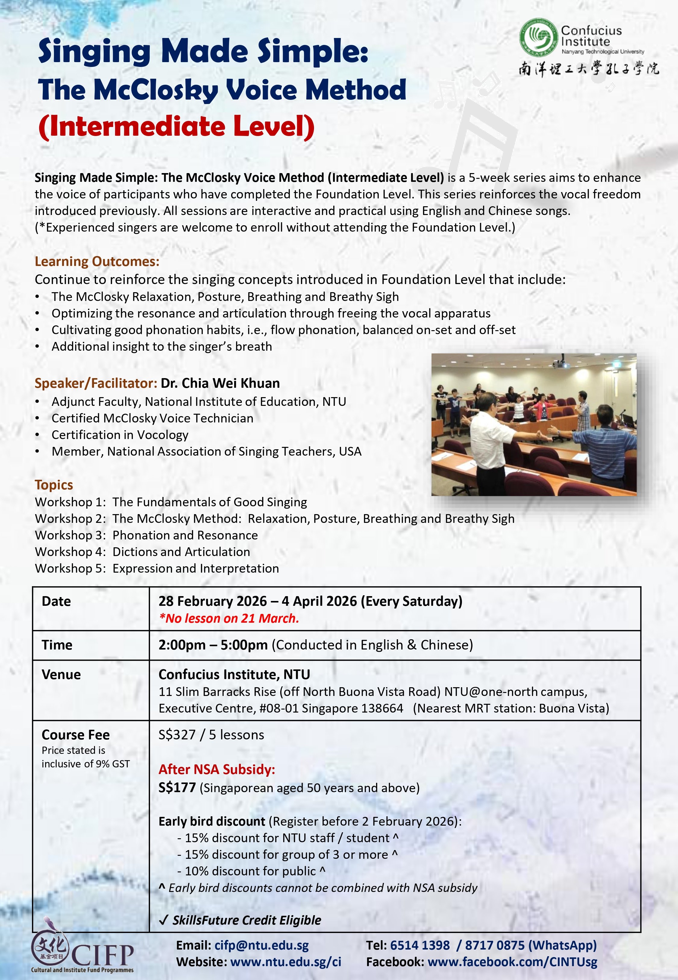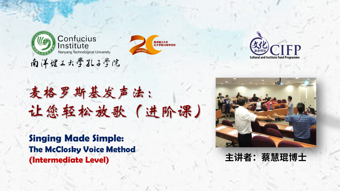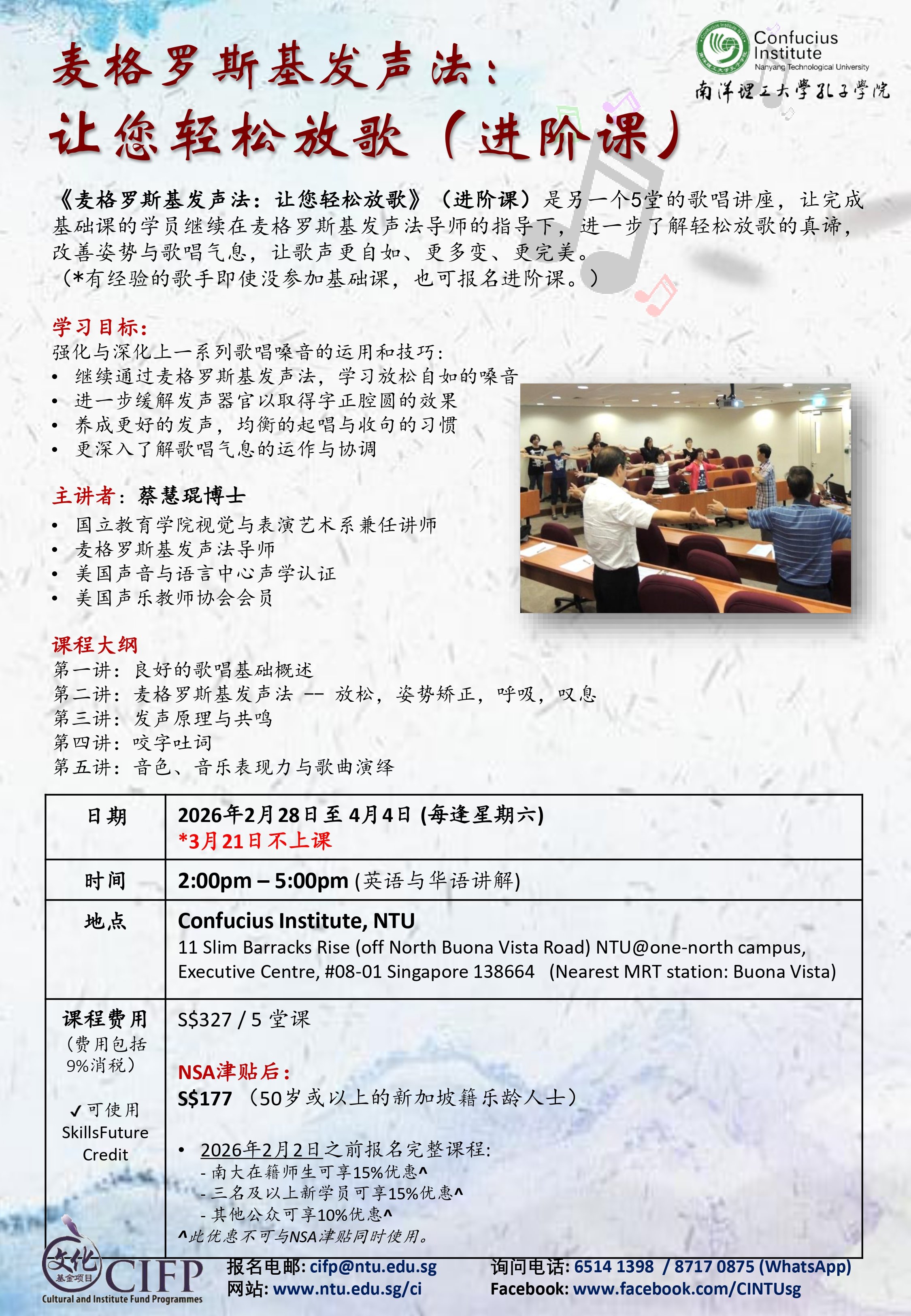 《麦格罗斯基发声法:让您轻松放歌》(进阶课)是另一个5堂的歌唱讲座,让完成基础课的学员继续在麦格罗斯基发声法导师的指导下,进一步了解轻松放歌的真谛,改善姿势与歌唱气息,让歌声更自如、更多变、更完美。