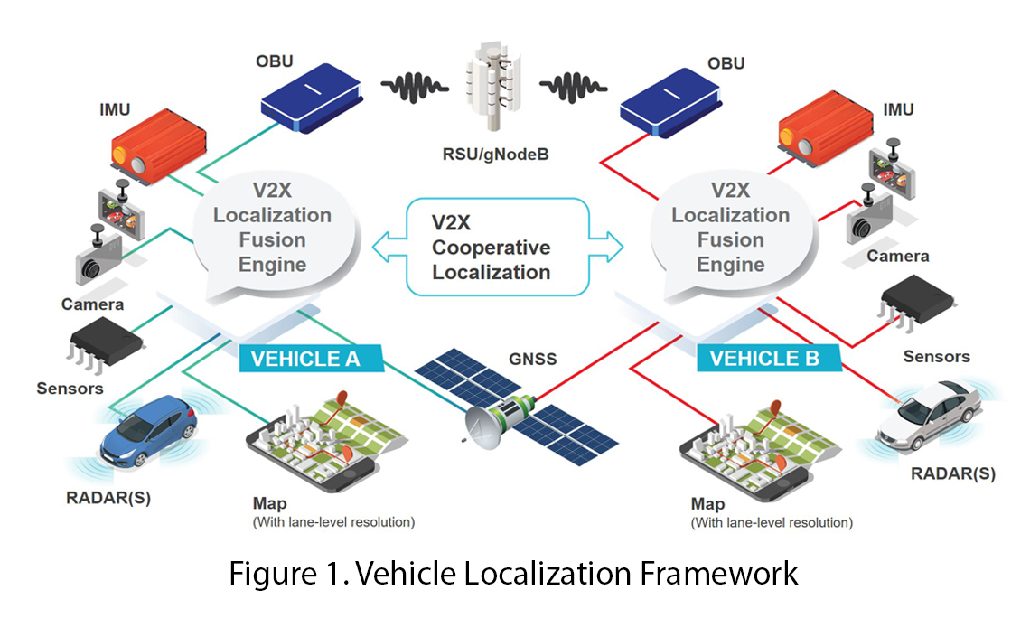 Given that the position of a vehicle is an important piece of information transmitted in a vehicle-to-everything (V2X) communication network and that it plays a critical role in many V2X applications, this project aims to leverage on the V2X network to mitigate and overcome the GNSS challenges through 2 methodologies. One, to adopt or develop suitable state space models and filtering algorithms to fuse information from the roadside units (RSU) or 5G base stations (gNodeB), on-vehicle sensors like GNSS, inertia measurement unit (IMU), camera, magnetic field sensors, and map information . Two, to develop distributed cooperative methods to allow different vehicles to share information via vehicle-to-vehicle (V2V) communications to make the overall localisation of a network of vehicles more accurate and robust. Figure 1 illustrates this framework.