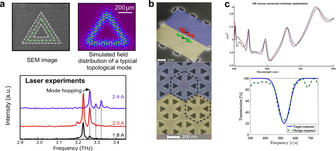 (a) Mode competition in the recently-developed topological laser. Top: SEM image of the laser and the simulated field intensity distribution of a typical mode. Bottom: Experimental results showing that only a few modes lase at a time, with mode-hopping as the pump current is increased (blue, red, and purple curves). (b) SEM images of a photonic spin Hall lattice previously been developed for quantum optical waveguiding, another good platform for studying mode competition in topological lasers. (c) Recent results from the literature showing that machine learning can perform “inverse design” of photonic structures that match an arbitrarily-chosen target scattering or transmission spectrum.