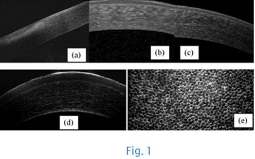 Comparison between current OCT technologies and sub-micrometer resolution OCT. (a) RTVue OCT (Optovue Inc., Fremont, CA, USA). (b) Slit-lamp OCT (Heidelberg Engineering GmbH, Heidelberg, Germany). (c) Cirrus OCT (Carl Zeiss Meditec, Dublin, OH, USA). (d) Sub-micrometer resolution OCT can clearly see all the tissue layers of rat cornea. (e) Sub-micrometer resolution OCT can clearly visualize endothelial cells.