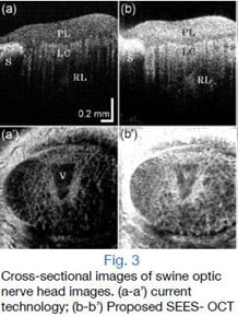 systems (Fig. 2) to visualise deep tissue structures of the optic nerve head of the eye. Imaging was performed using optic nerve head (ONH) tissues from swine eyes ex vivo to demonstrate a sensitivity advantage of 5-dB over the corresponding point source system without significant degradation in spatial resolution (Fig. 3). Any existing ophthalmic OCT system can be easily modified to switch between the point source mode and the extended source mode through a simple switch mechanism. Based on its merits in sensitivity and flexibility, this technique may help to visualise deep ocular tissue structures which are at risk of damage in glaucoma, such as the lamina cribrosa, the posterior sclera, and the retro-laminar tissues.