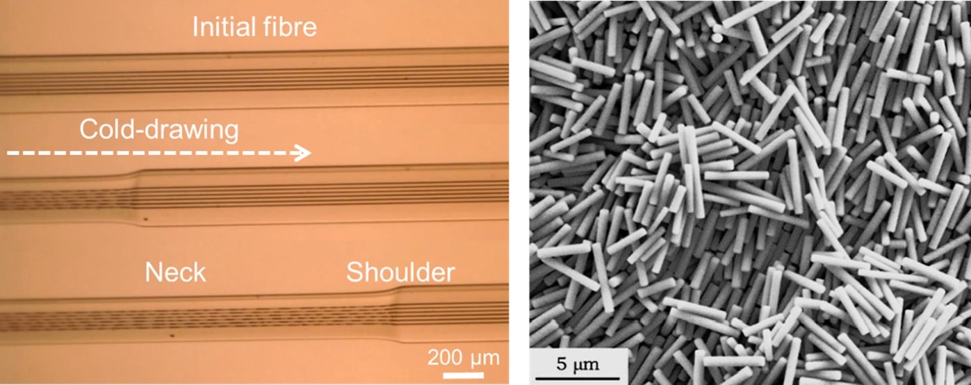 The underlying technology, a process called cold-drawing, has been used for almost a century in the production of synthetic fibres such as polyester and nylon, and has become a rather mature technique for producing fibres of high tensile strength and flexibility. Dr. Wei Lei and his collaborators, however, have found that under the right conditions, some materials embedded within synthetic polymer fibres naturally break apart into pieces of uniform length. The cause of this surprising phenomenon is a kind of wave that sweeps along the polymer fibre during the drawing process. This wave is known as a “neck,” since it propagates in the form of a depression with moving “shoulders” that continuously extend in opposite directions until they span the whole fibre length. As the shoulders propagate down the fibre, they pinch off any brittle threads embedded in the fibre, which break apart into short, uniformly sized segments, as shown in Figure 1. The result can be a bundle of short rods kept in place within the polymer fibre, or the polymer can be dissolved away to leave a collection of separated rods of precisely matched size and shape, which can be of a nanoscale size that would be difficult to manufacture by other methods. This represents a novel, scalable route to production of nano- and micro-particles of almost arbitrary cross-section. Remarkably, the cold-drawing process is highly robust and can even be done - literally - by hand!