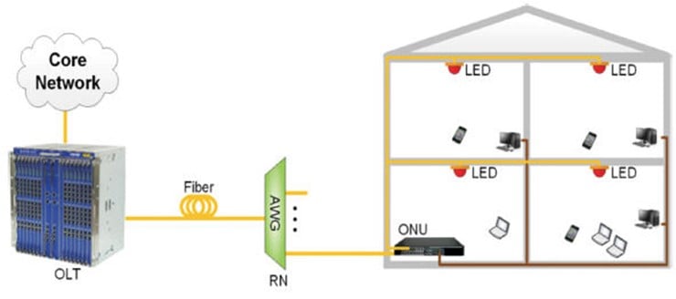 Architecture of integrated WDM-PON based wired and wireless (VLC) access network for the indoor applications.