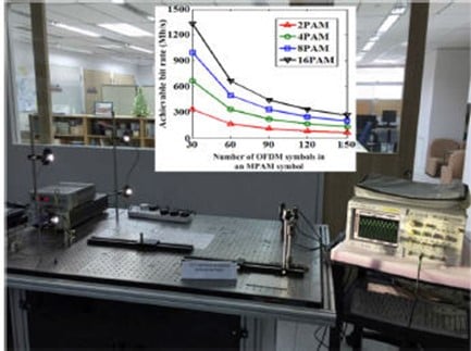 Demonstration of VLC in Lab. The inset shows the achievable bit rate vs. number of OFDM symbols
