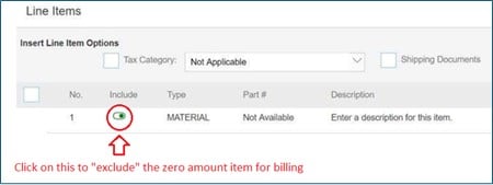 To resolve this, please exclude any zero-amount items by clicking on the "green dot" when editing the invoice, as shown in the example below.
