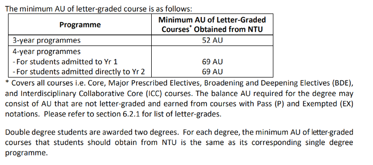 In granting exemption of courses on the basis of the students’ relevant certificate/diploma (e.g. A level, foreign or local university, polytechnic diploma, Olympiad medals), we wish to draw your attention that a minimum of [X] AU of letter-graded courses is required for a Bachelor's degree, as specified in Section 3.4 in the Academic Structure Handbook: