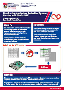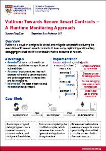 | PHANG JUN YU Proof-of-Concept Blockchain Application for Access Controlled File Transfer | RON NG JIAN YING Pre-Fuzzing Analysis of Embedded System binaries with Ghidra SRE | YANG XUAN Vultron: Towards Secure Smart Contracts – A Runtime Monitoring Approach |