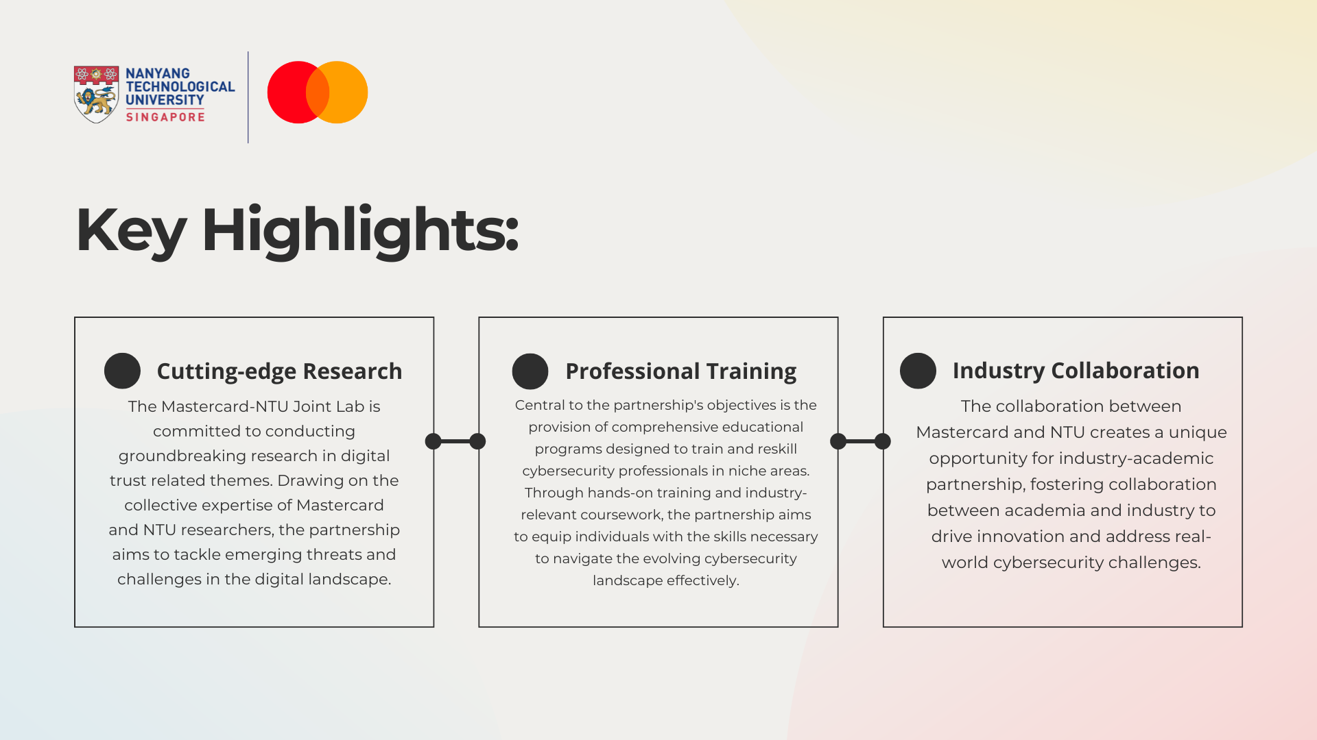 Mastercard and NTU share a deep commitment to building a secure, trusted and resilient digital ecosystem in the Asia Pacific region. Toward this, in 2022, the Mastercard-NTU Joint Lab was established to advance digital trust and cybersecurity. Leveraging Mastercard's industry expertise and NTU's educational resources, the lab leads research and training programs to enhance cybersecurity infrastructure and foster digital trust. This collaboration is crucial in addressing cybersecurity challenges and empowering individuals and organizations to navigate the digital landscape confidently. As technology evolves, Mastercard and NTU are committed to building a secure, trusted, and resilient digital future.