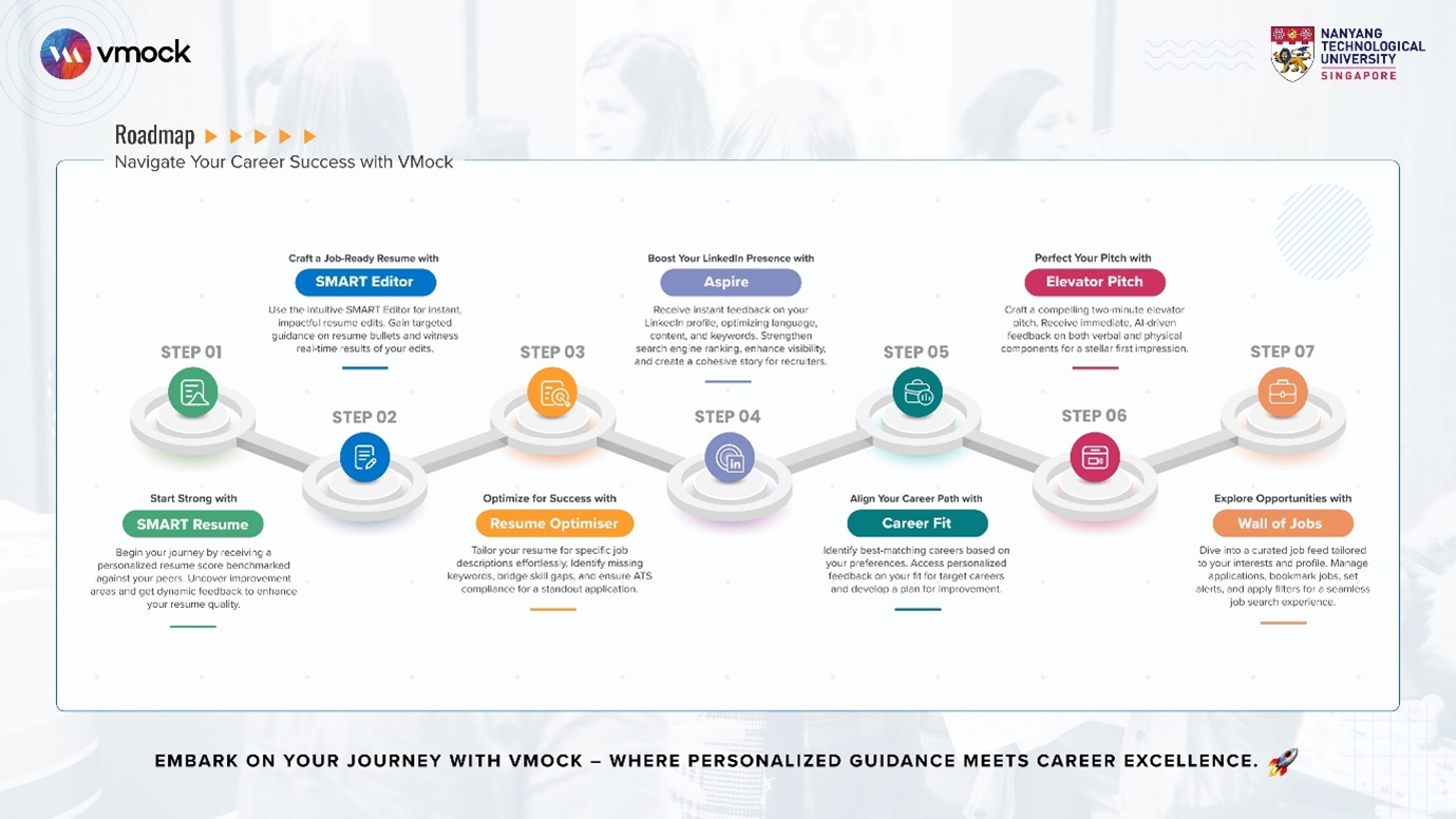 VMock is a 24/7 virtual career assistant with cutting-edge technologies, such as artificial intelligence, to deliver immediate, tailored feedback on your resume and video interviews. You can access the portal via www.vmock.com/ntu.