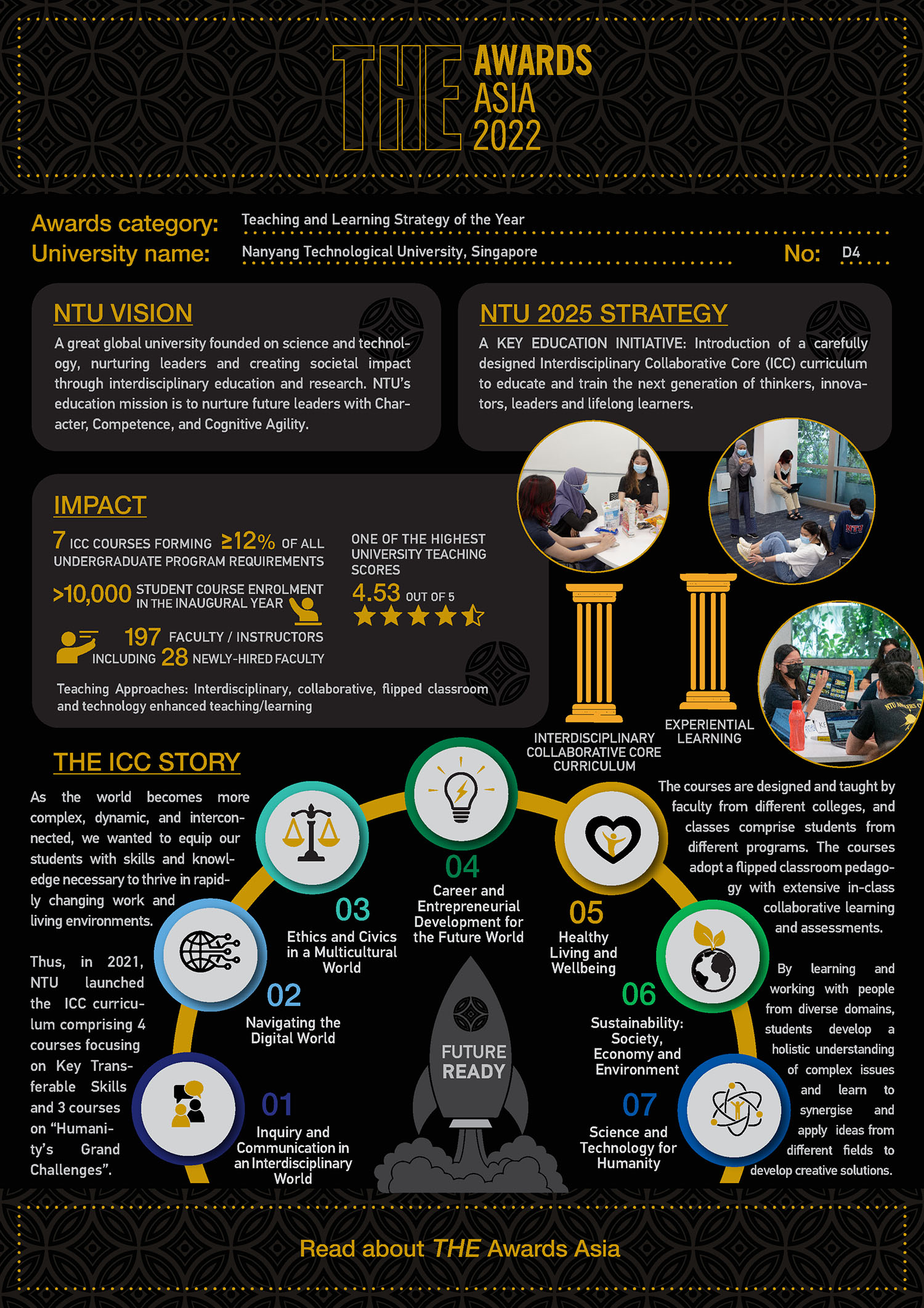 The NTU ICC Curriculum was among the 8 finalists shortlisted for the THE Awards under the category of Teaching and Learning Strategy of the Year in both 2022 and 2023.