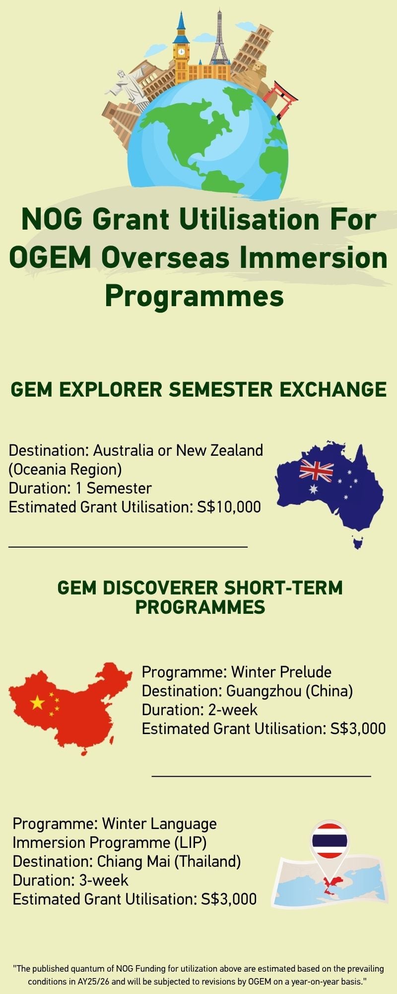 Each NOG Awardee is entitled to use up to S$10,000 to embark on credit bearing overseas immersion programmes offered by OGEM.