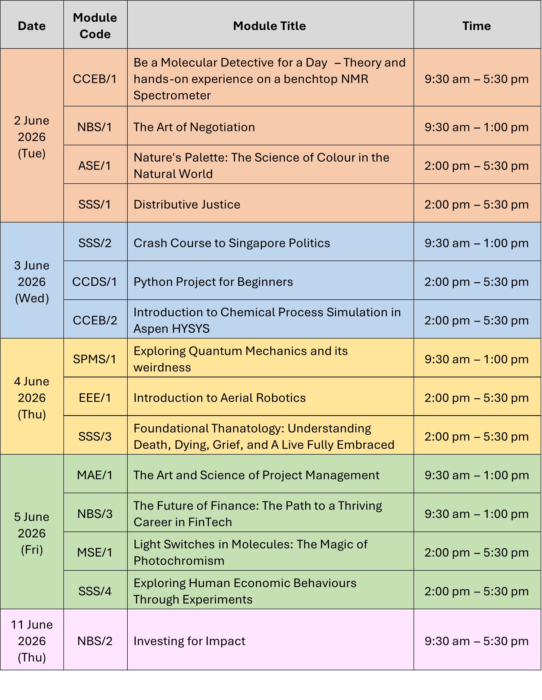 Placement into a module is subject to the availability and the school's endorsement. In the event that a module be oversubscribed, priority may be given to JC2/Year 6 students, and academic merit may also be considered. The application outcome will be released via email in mid-April.