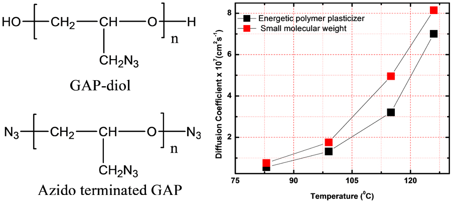 These energetic polymer based plasticizers are structurally similar to binder matrix and resist the migration due to enhanced miscibility. Low molecular weight (Mw= 650 to 800 g/mole) GAP polymers have been developed as efficient plasticizers to improve the mechanical properties of GAP binder. However, the plasticization effect will be hampered, if the terminal hydroxyl groups of GAP plasticizer react with the isocyanate curing agent. Azido terminated GAP plasticizers (GAPA) are also developed, in which the terminal hydroxyl groups of the GAP plasticizer are converted to azido groups.
