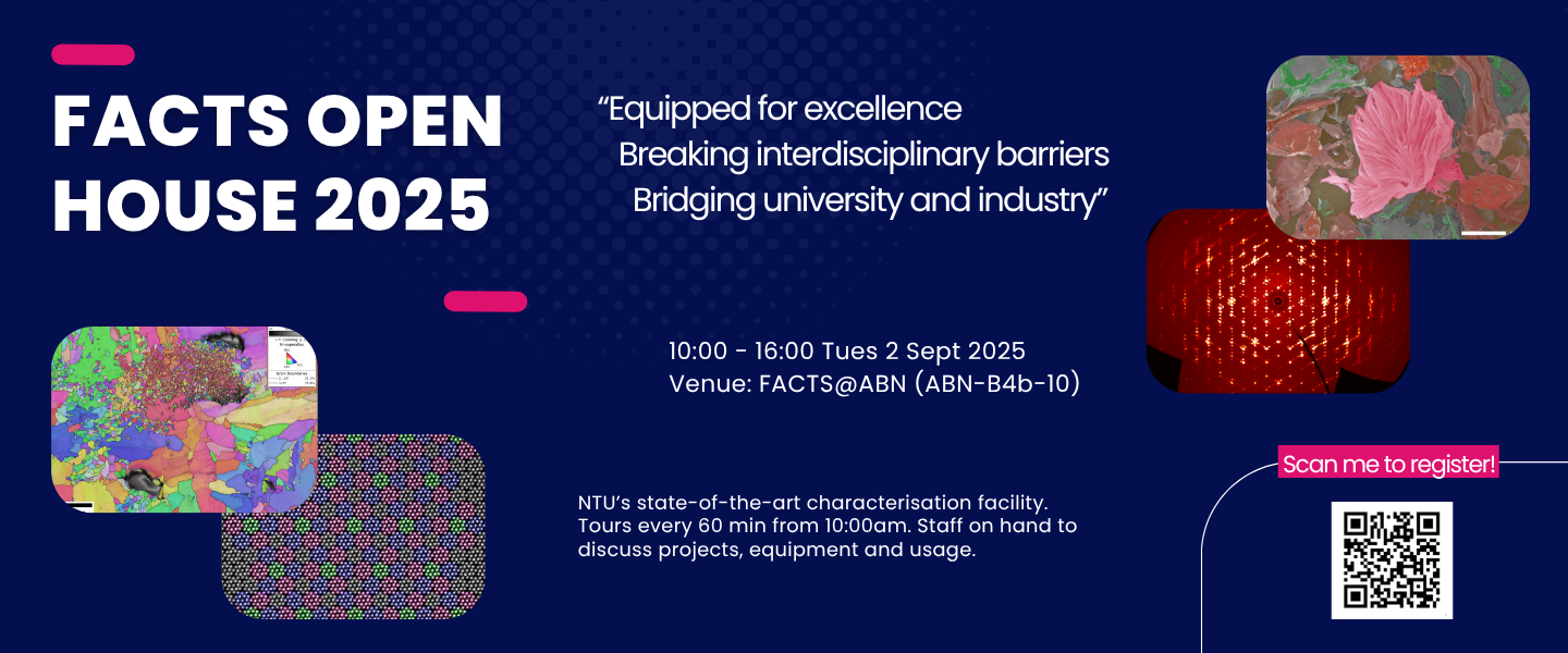 NTU FACTS cordially invites you to our Open House on 2 Sep 2025 (Tue), 10am to 4pm! Come down to have a look at our Electron Microscopy, X-ray Diffraction and Surface Analysis instruments and chat with our scientists about how our equipment can help your experiments and work.