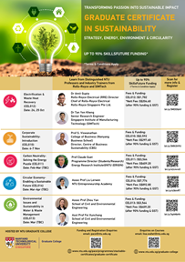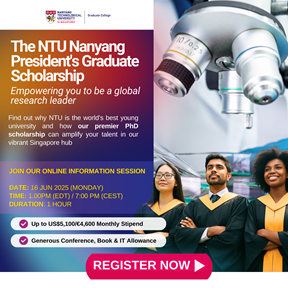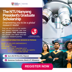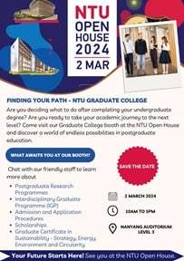 Graduate College at NTU seeks to promote intellectually stimulating environment within which cross-pollination of ideas can flourish between disciplines, students and their advisors. We emphasize the importance of holistic education, innovative framework, experience and collaborative learning. NTU’s graduate education aims to groom future thought and industry leaders by preparing graduates with comprehensive technical and transferable skills that will help them make global impacts beyond the Singapore ecosystem. Our students shall become leaders with character, competence and cognitive agility, ready to tackle challenges of tomorrow, to become change agents, and to make great societal impact.