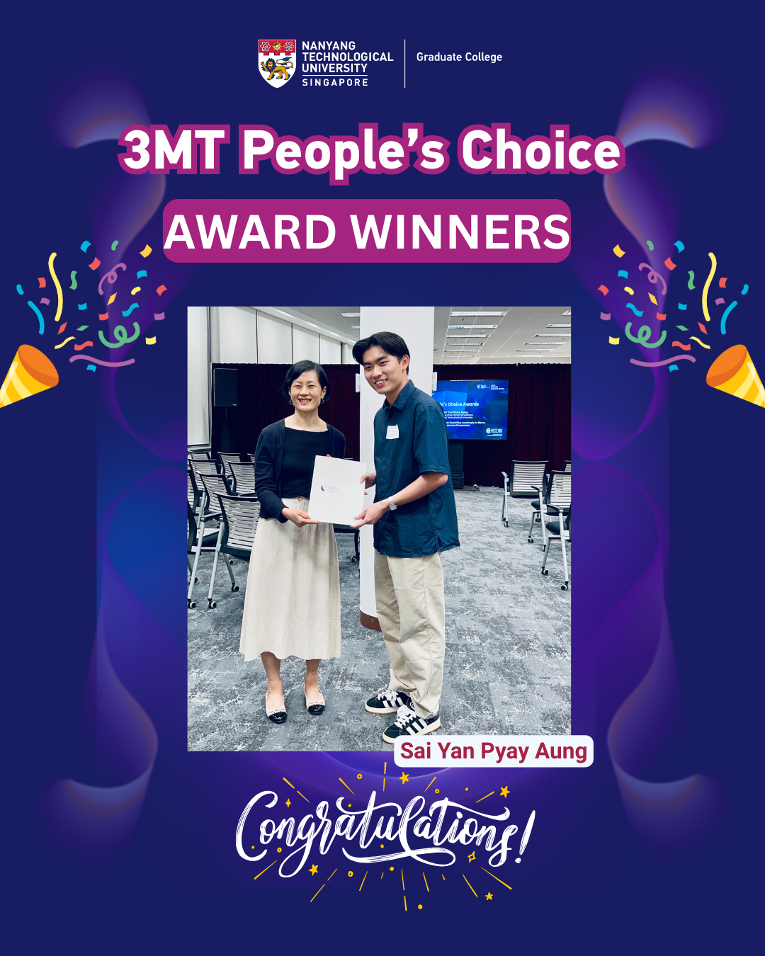 NTU students Wang Yuchen and Sai Yan Pyay Aung clinched two People’s Choice Awards at the Singapore 3MT Meet 2025