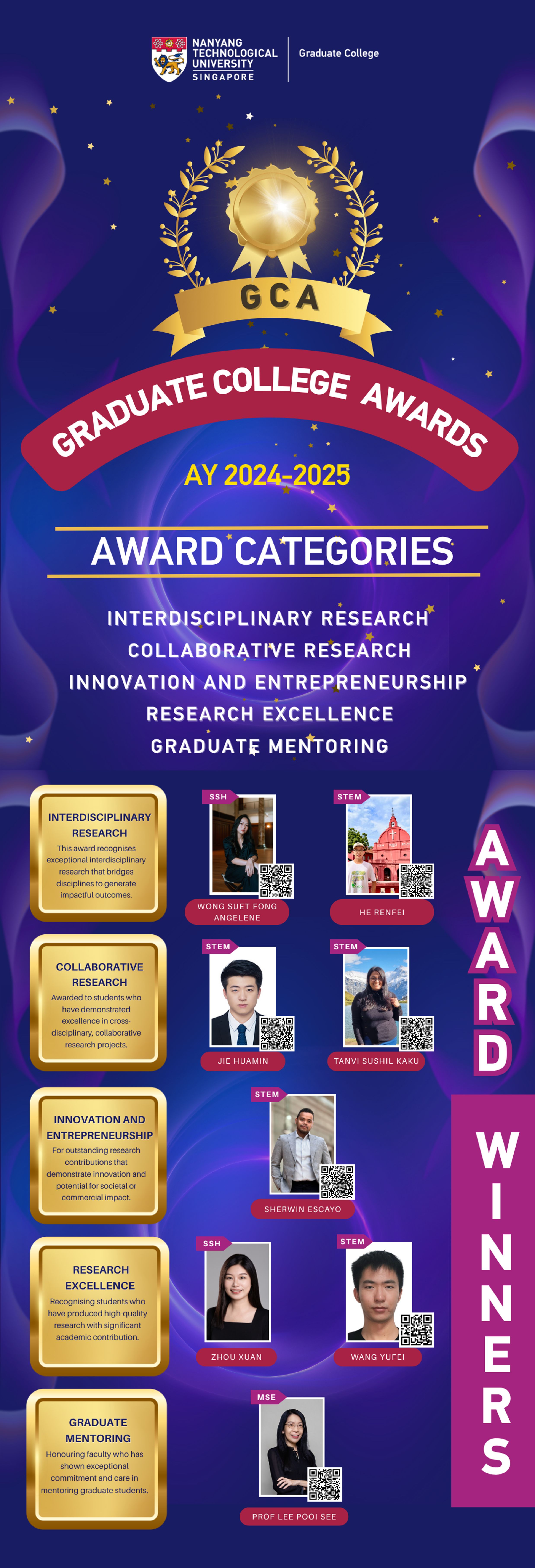 The Graduate College Awards aim to recognise and reward outstanding graduating PhD and Master by Research students for academic, collaborative, interdisciplinary and entrepreneurial achievements during their postgraduate studies in NTU. Supervisors are also recognised for their outstanding mentoring efforts of graduate students.