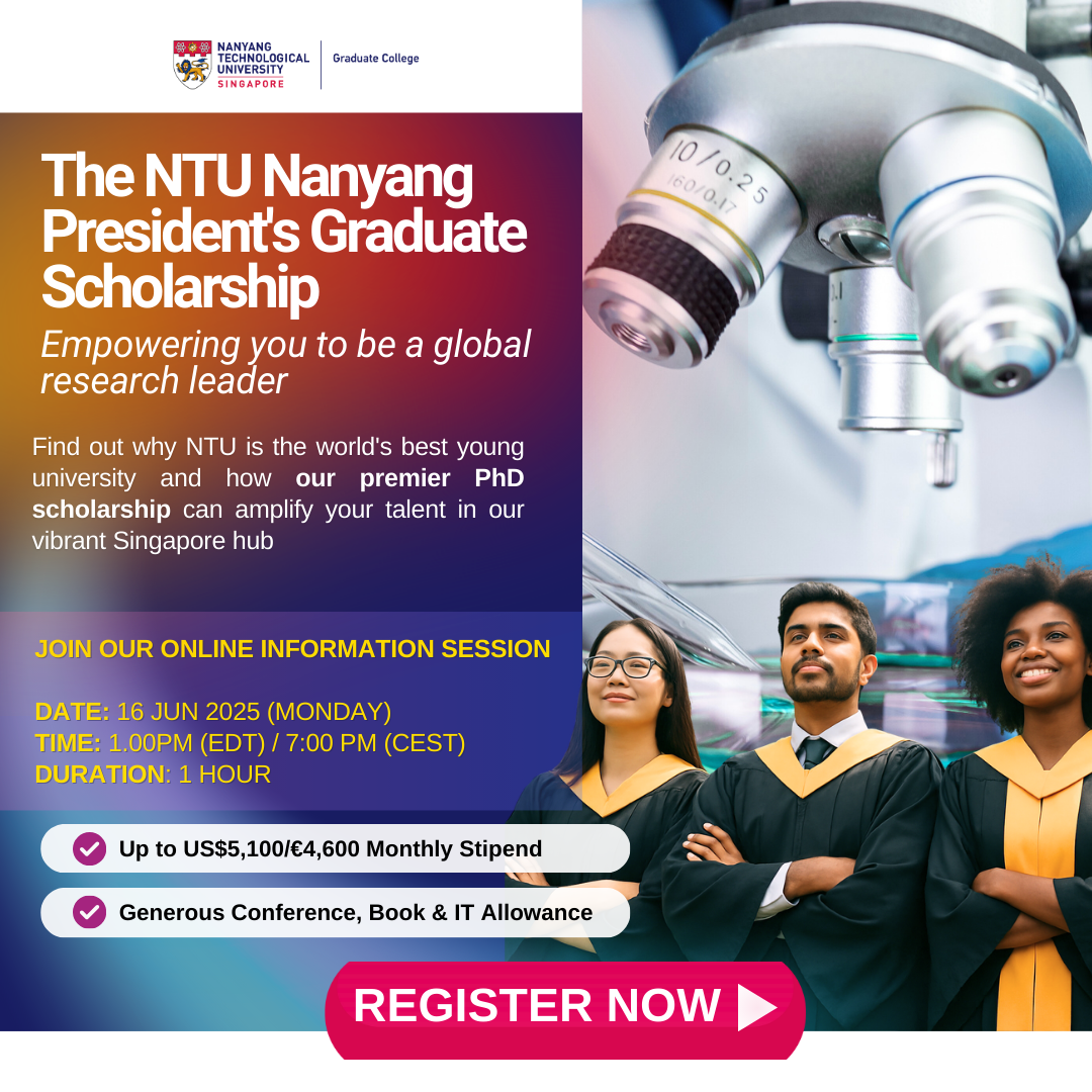 NTU Singapore offers world-class graduate training in the vibrant heart of Asia as your springboard to a global career. Find out about the prestigious Nanyang President's Graduate Scholarship (NPGS), now accepting local and international PhD applicants for 2026 entry.