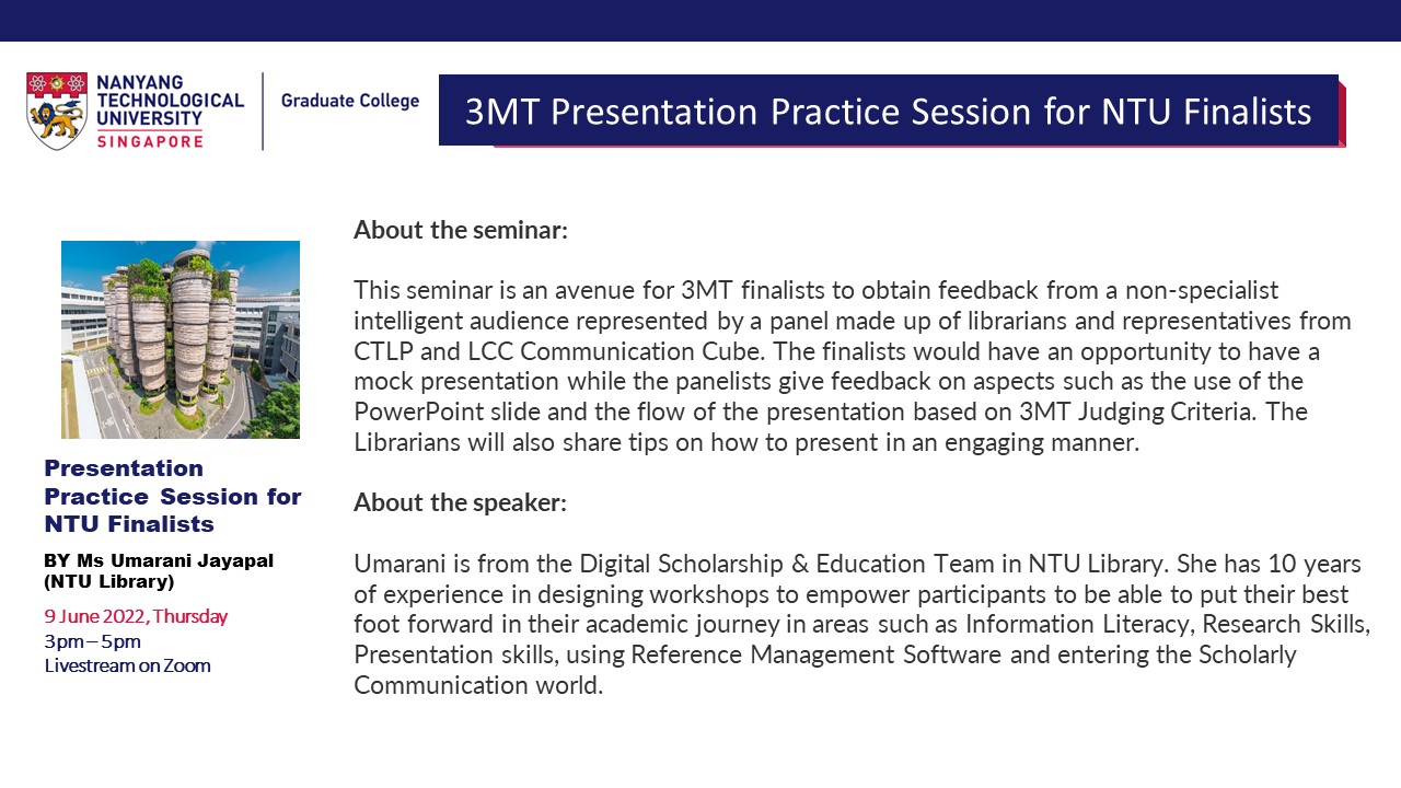 Title: 3MT Presentation Practice Session for NTU Finalists