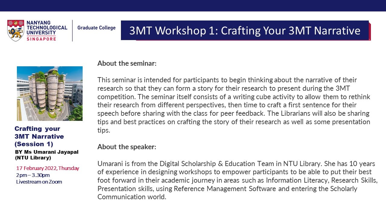 Title: 3MT Workshop 1: Crafting Your 3MT Narrative (Session 1)