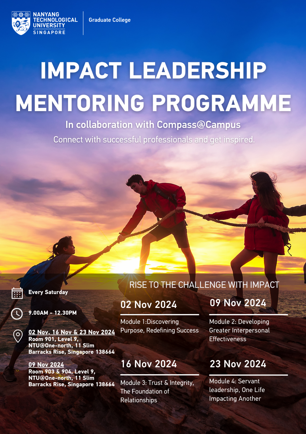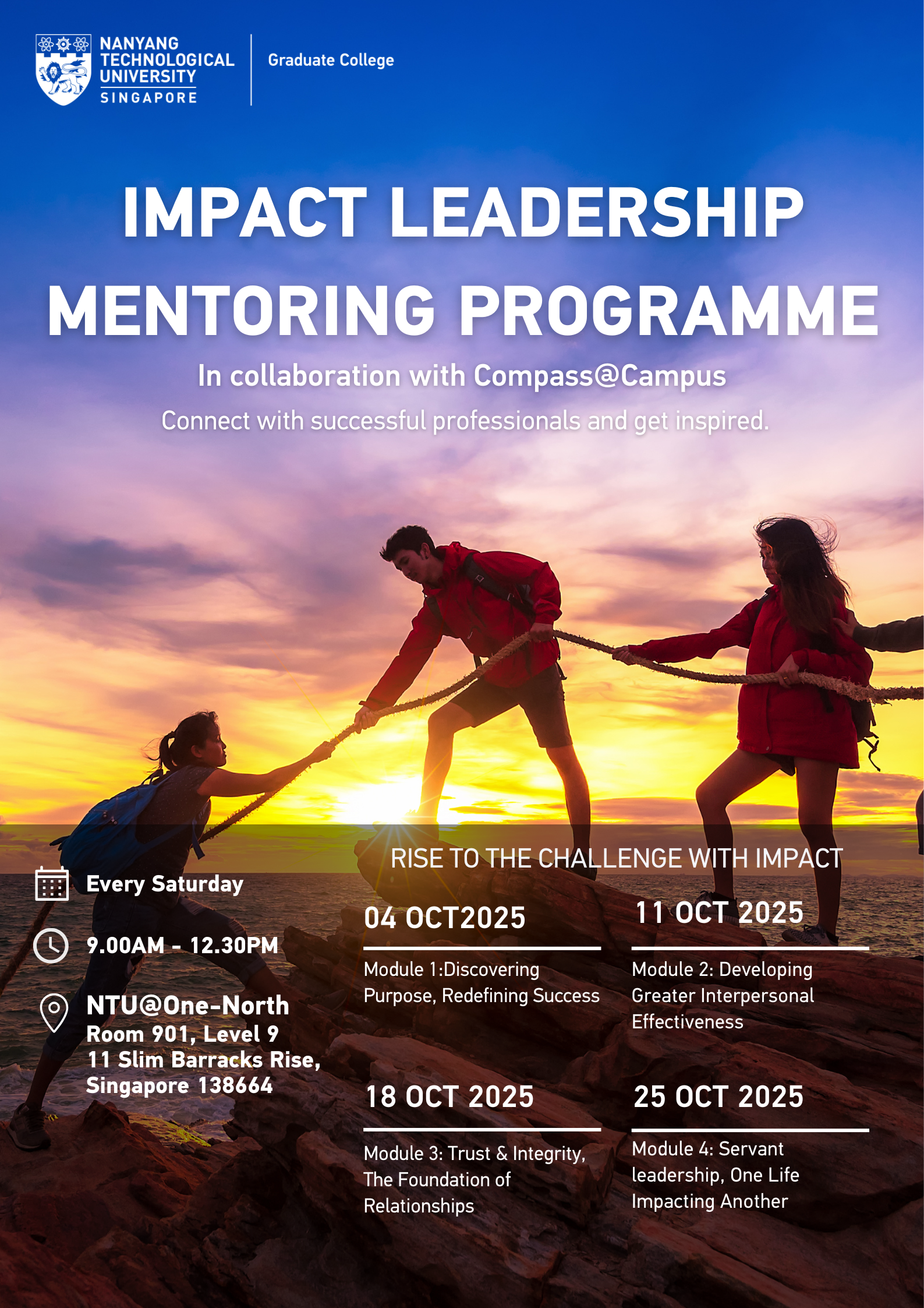 Graduate College (GC) in collaboration with Compass@Campus jointly bring to you "Impact Leadership Mentoring Programme" on every Saturday from 04 0ct - 25 Oct 2025, 9am to 12.30pm, at NTU@One-north (not at NTU Main campus).
