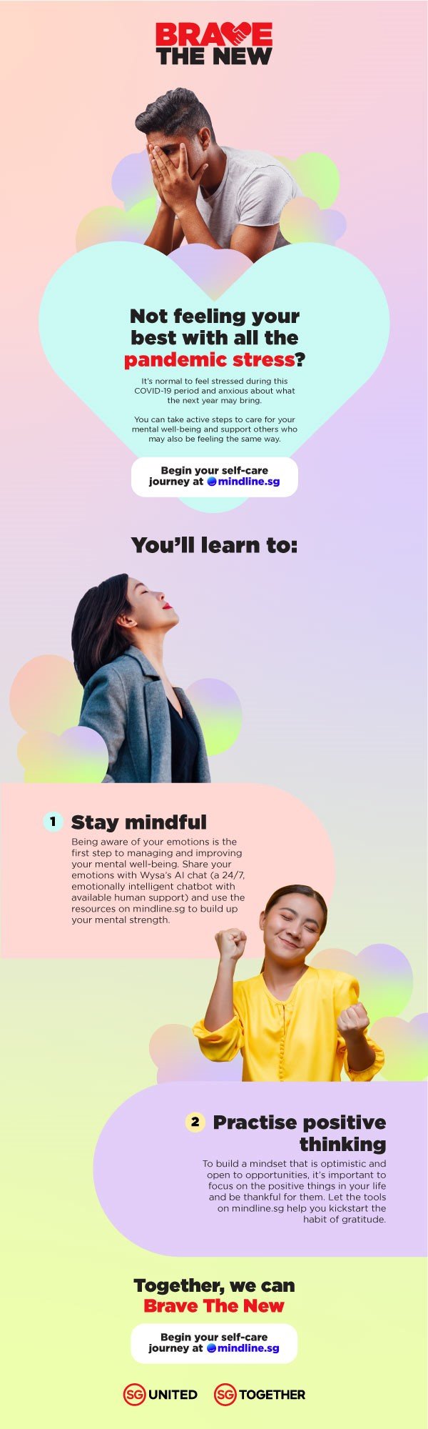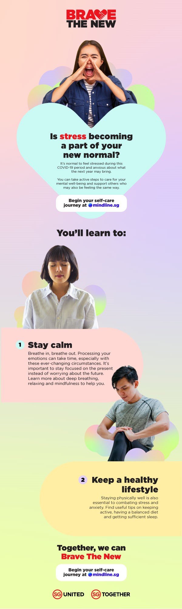 COVID-19 has brought about profound changes to our lives, and many Singaporeans are feeling stressed and anxious, arising from concerns over employment, health and lifestyle impacts. With the Brave The New campaign, MCCY hopes to raise awareness that it is normal to feel stressed and anxious, and there are ways we can take care of ours / others’ mental well-being. The campaign provides tips and resources through links to Mindline.sg for one to manage one’s well-being.