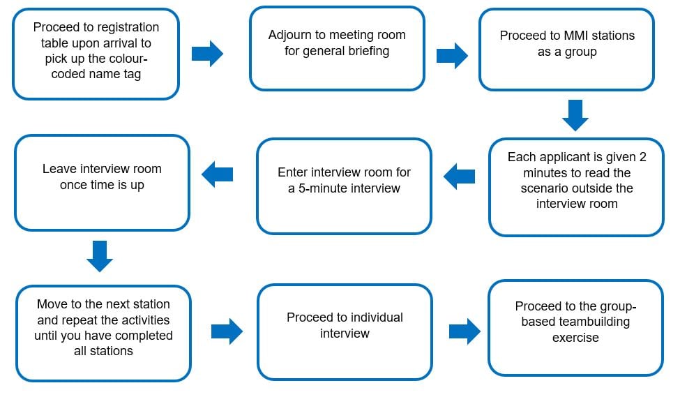 The MMI session lasts approximately two and a half hours as the applicants have to undergo several activities as shown below. All applicants have to go through the entire process.