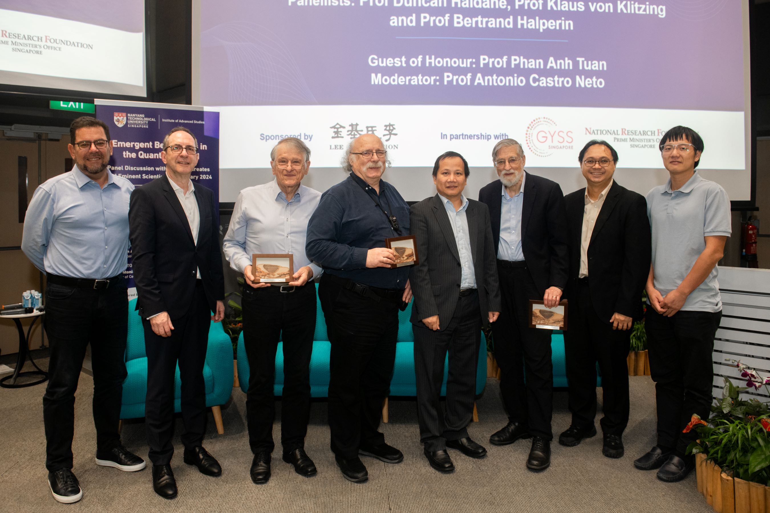 Our eminent panellists, Nobel laureates Prof Duncan Haldane and Prof Klaus von Klitzing, were appointed as Lee Kong Chian Distinguished Professors in relation to the panel discussion on 4 January 2024. Sponsored by Lee Foundation and organised as a partner event of the Global Young Scientists Summit 2024, the panel discussion was held in conjunction with the 9th International Workshop on Emergent Phenomena in Quantum Hall Systems at SPMS NTU. Themed "Emergent Behaviours in the Quantum World, the discussion symphonised the ideas, insights, and the collective wisdom of Prof Duncan Haldane, Prof Klaus von Klitzing, and Prof Bertrand Halperin.