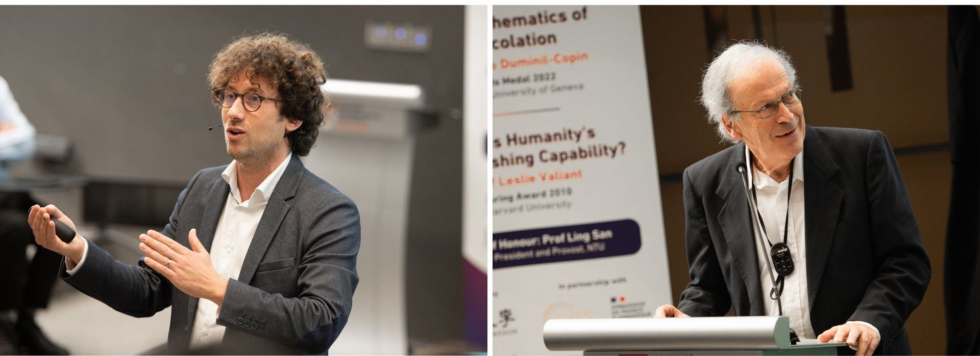 Engaging lectures by Prof Hugo Duminil-Copin on percolation (left) and Prof Leslie Valiant on humanity's distinguishing capability.